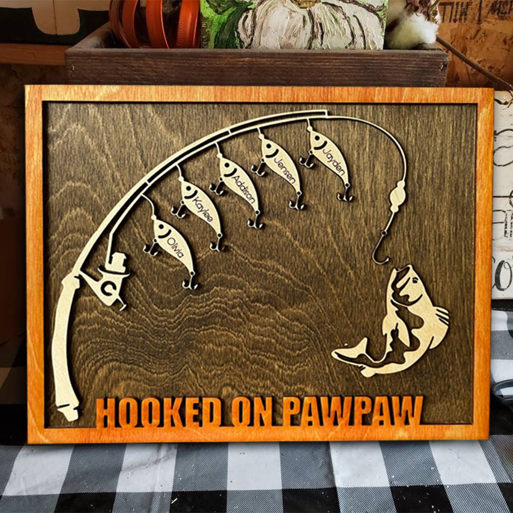 Personalised Fish Hooked on Papa Wooden Frame Sign With Kids Names Father's Day Gift Ideas Unique Gift For Dad