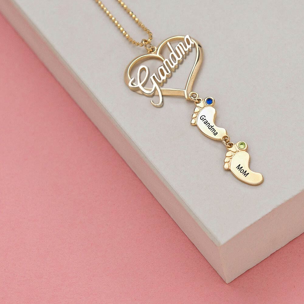Personalised Grandma Birthstone Necklace With Engraved Names Baby Feet Pendants Family Gift For Grandma