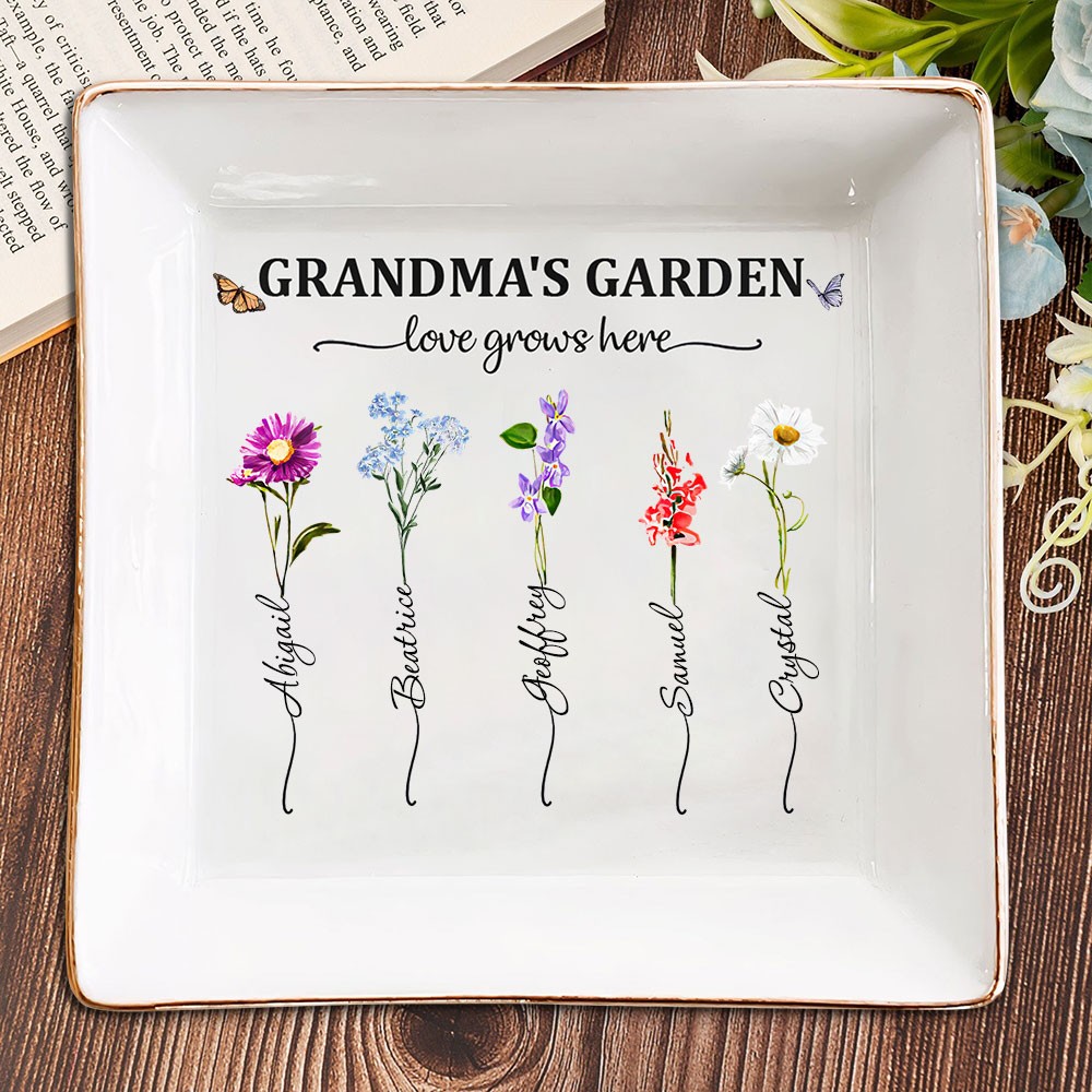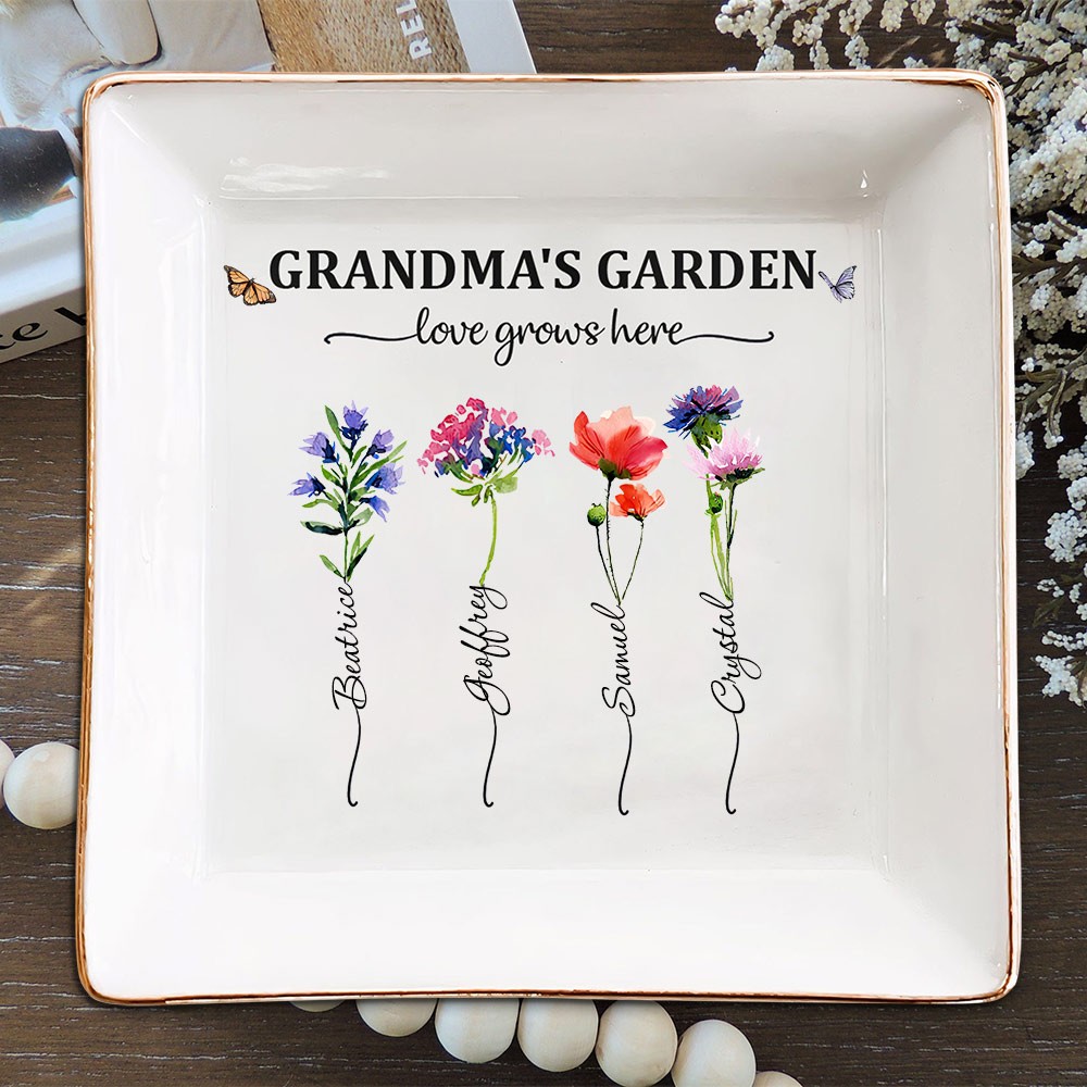 Personalised Grandma's Garden Birth Flower Jewellery Dish with Kids Names Gift for Mum Grandma Christmas Gift