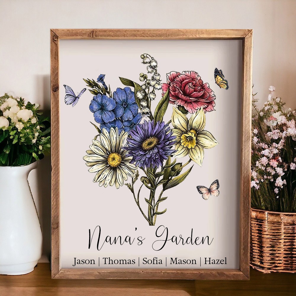Personalised Grandma's Garden Birth Month Flower Bouquet Frame Sign with Kids Names Christmas Gifts for Grandma Mum