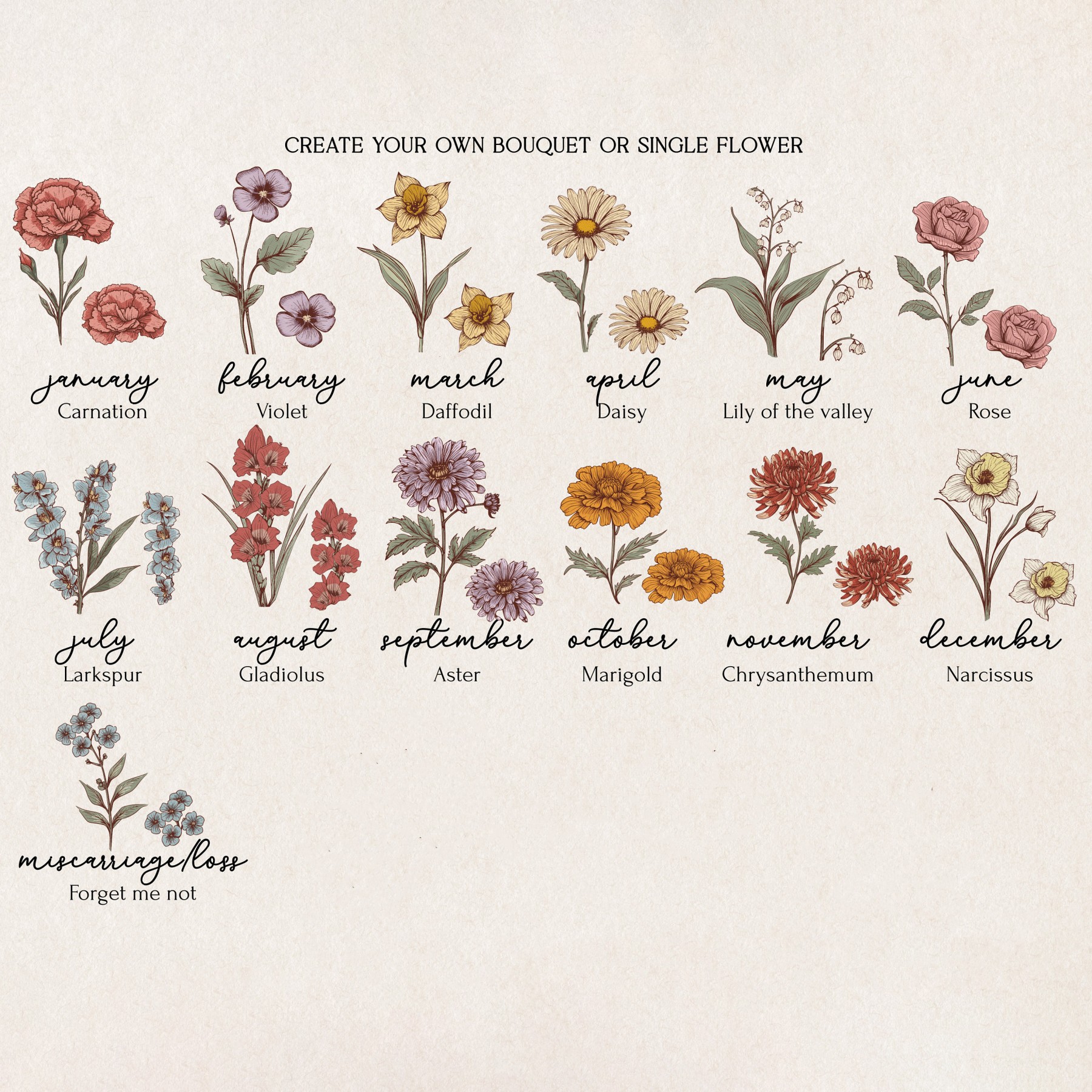 -- Select 8th Flower Type -- January-Carnation February-Violet March-Daffodil April-Daisy May-Lily of the Valley June-Rose July-Larkspur August-Gladiolus September-Aster October-Marigold November-Chrysanthemum December-Narcissus Miscarriage & Loss-Forget me not