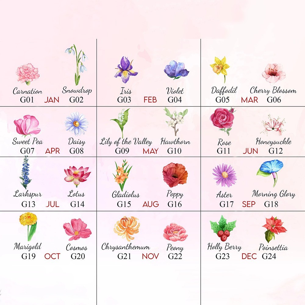 -- Select 12th Flower Type -- January-Carnation January-Snowdrop February-Iris February-Violet March-Cherry Blossom March-Daffodil April-Sweet Pea April-Daisy May-Lily of the Valley May-Hawthorn June-Honeysuckle June-Rose July-Larkspur July-Lotus August-Poppy August-Gladiolus September-Aster September-Morning Glory October-Marigold October-Cosmos November-Chrysanthemum November-Peony December-Holly Berry December-Poinsettia