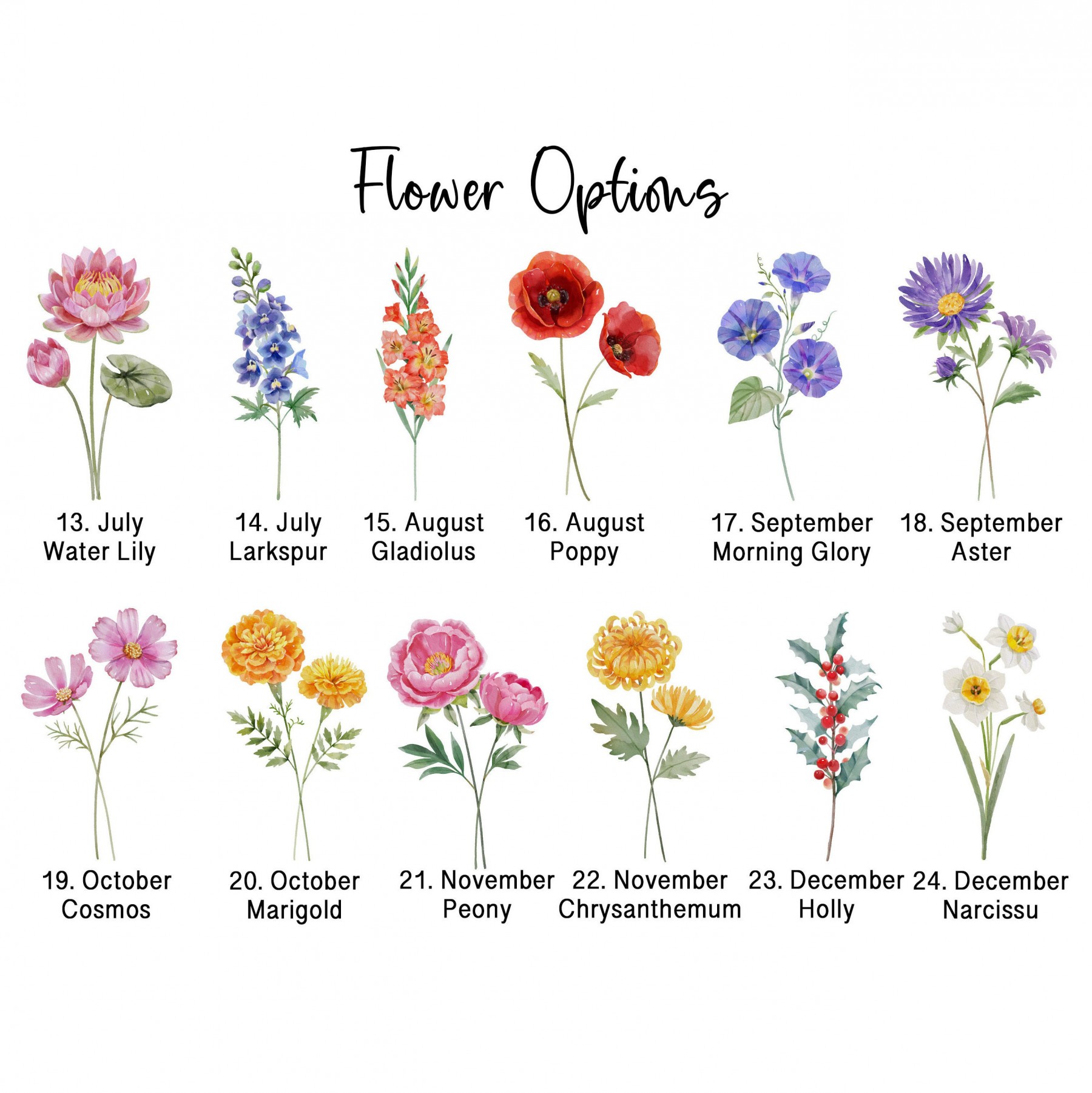 -- Select 13th Flower Type -- January-Carnation January-Snowdrop February-Iris February-Primrose March-Cherry Blossom March-Daffodil April-Sweet Pea April-Daisy May-Lily of the Valley May-Hawthorn June-Honeysuckle June-Rose July-Larkspur July-Water Lily August-Poppy August-Gladiolus September-Aster September-Morning Glory October-Marigold October-Cosmos November-Chrysanthemum November-Peony December-Holly December-Narcissus