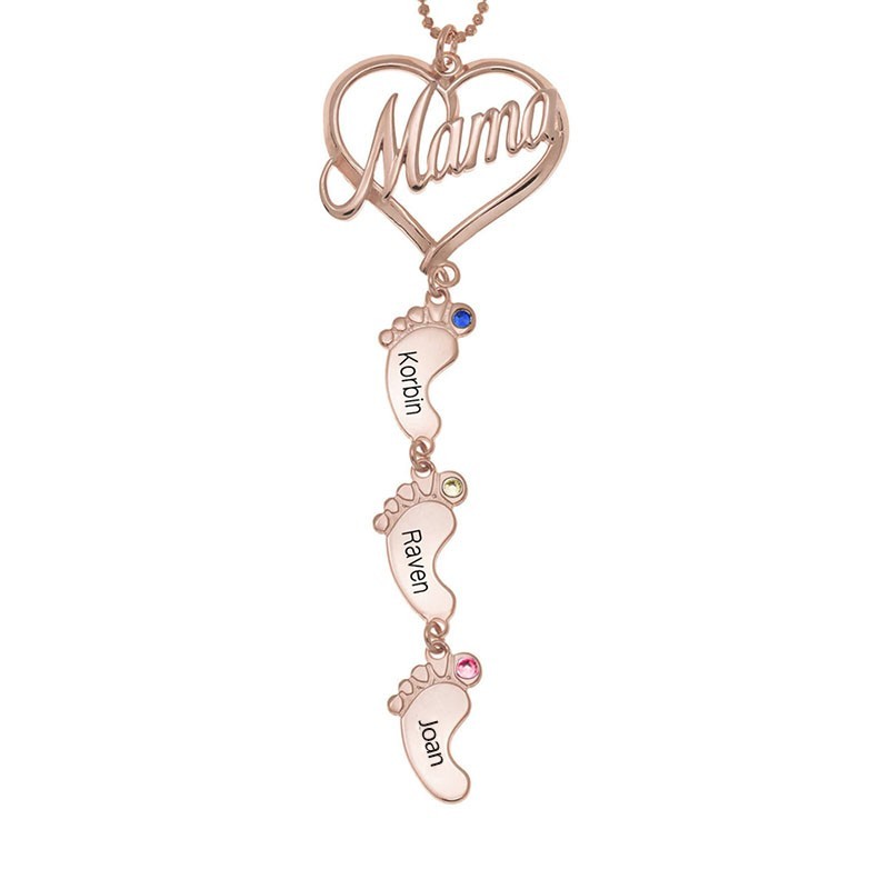 Personalised Mama Name Birthstone Necklace with Baby Feet Pendants Mother's Day Gift Ideas