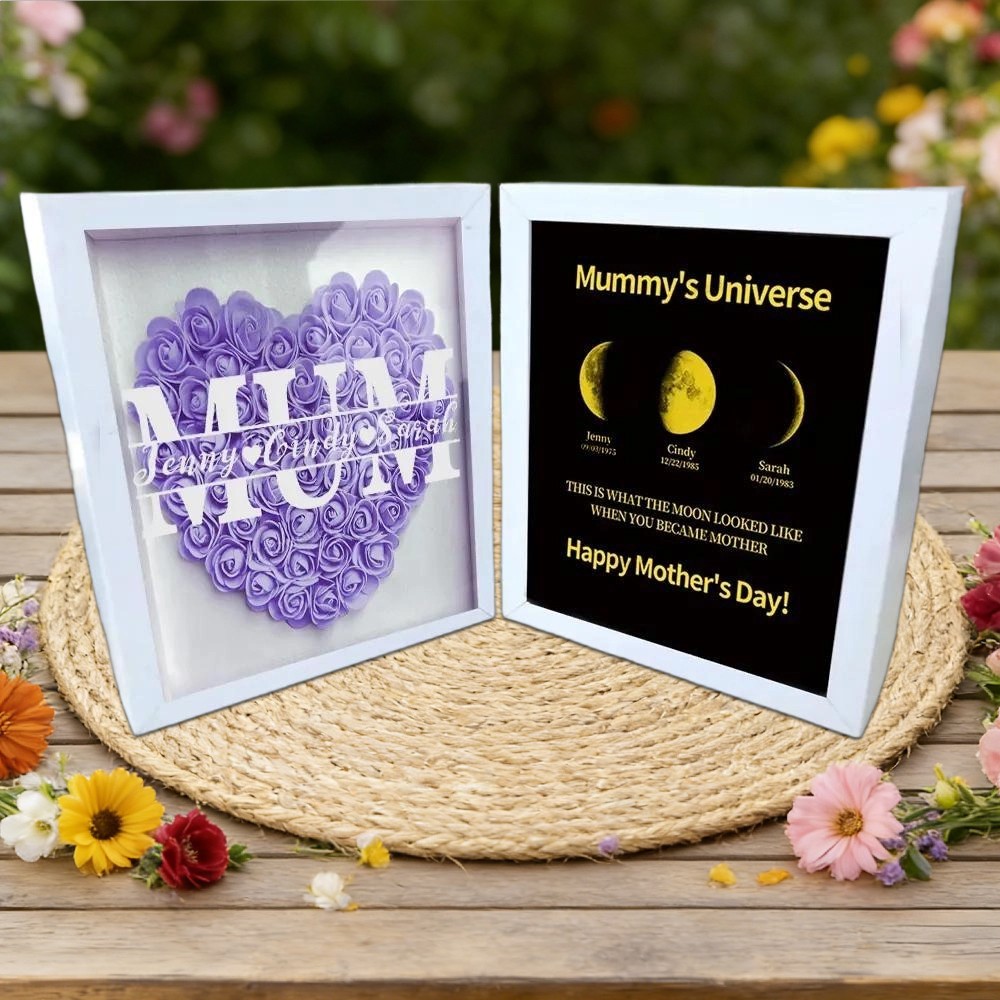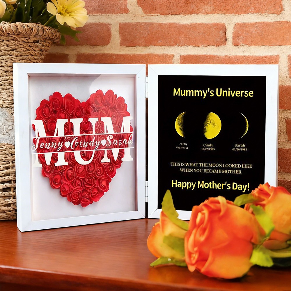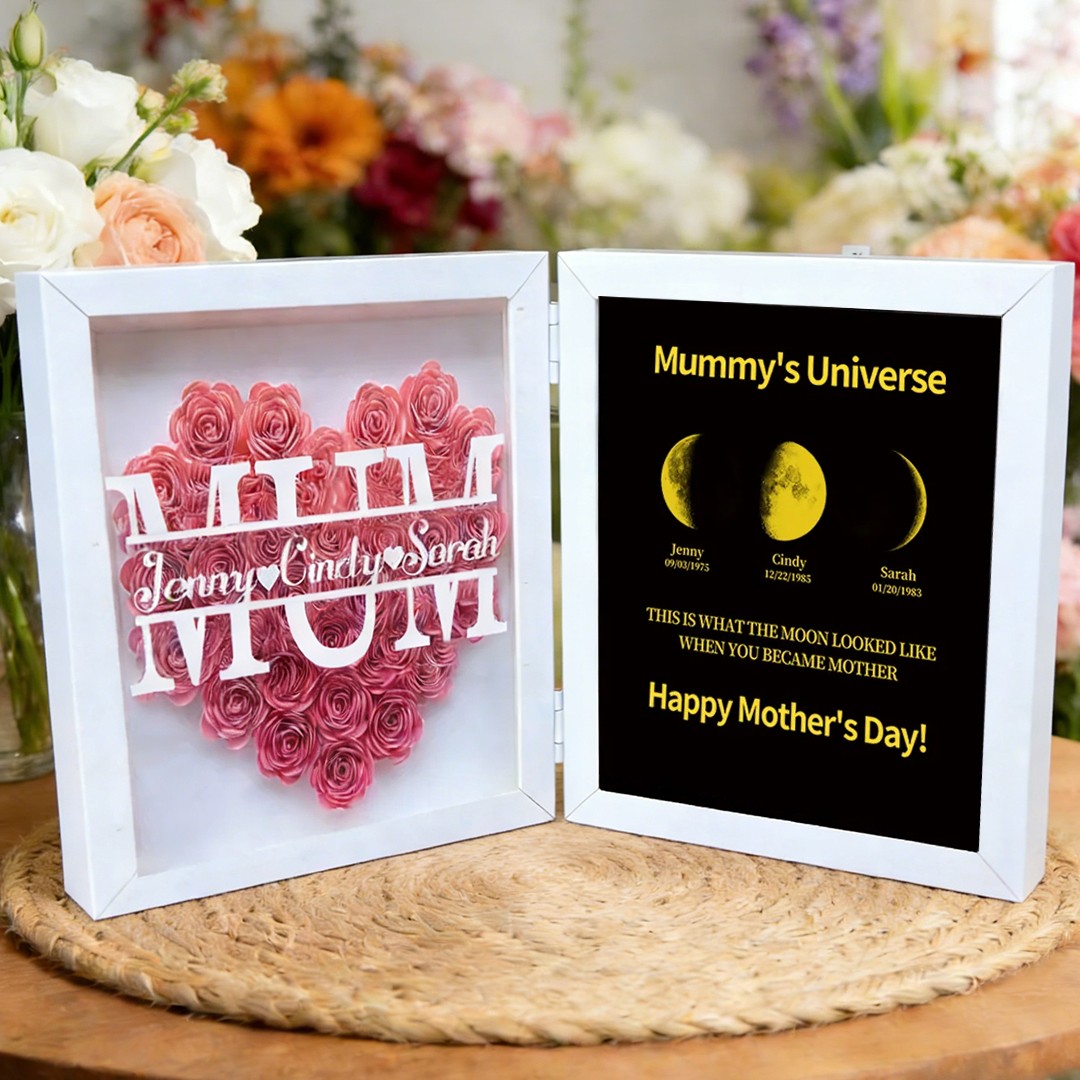 Personalised Mum Flower Shadow Box Linked with Moon Phase Frame Art Print With Kids Names Family Keepsake for Mum Grandma Mother's Day Gift Ideas