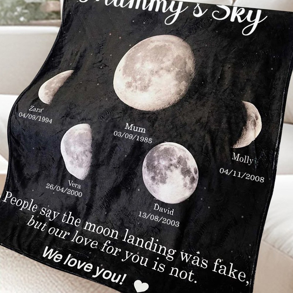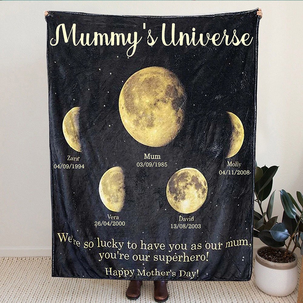Personalised Mummy's Sky Moon Phase Family Blanket With Kids Names Unique Birthday Keepsake Gift For Mum