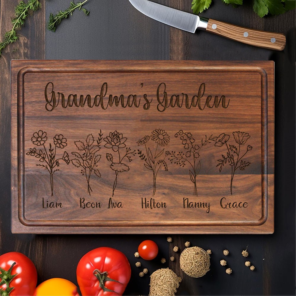 Personalised Nana's Garden Kitchen Birth Flower Cutting Board with Names Gifts for Mum Grandma