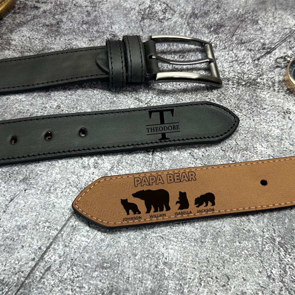 Personalised Papa Bear Leather Belt with Engraved Kids Names Father's Day Gift