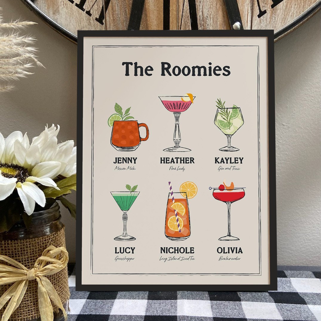 Personalised Roommates Drinks Art Print Frame with Names College Apartment Dorm Art Unique Gifts for Friends