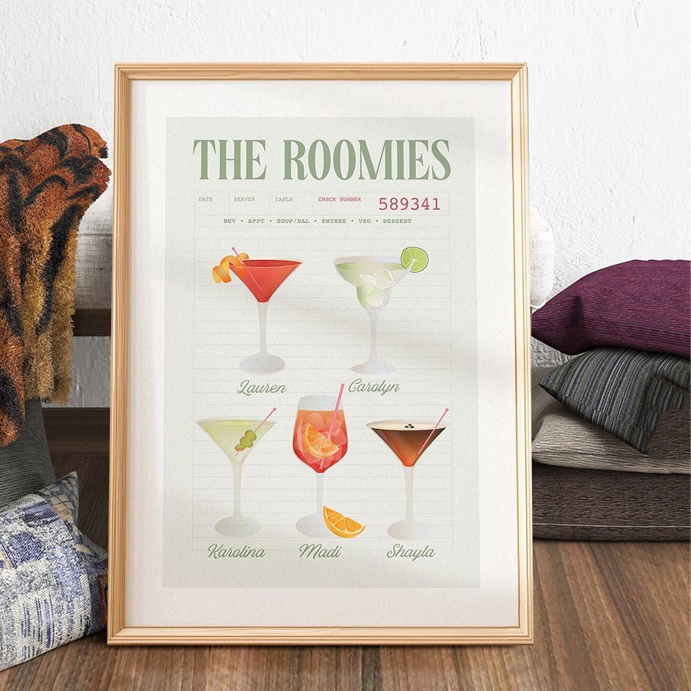 Personalised Roommates Drinks Art Print Frame with Names College Apartment Dorm Art Unique Gifts for Friends