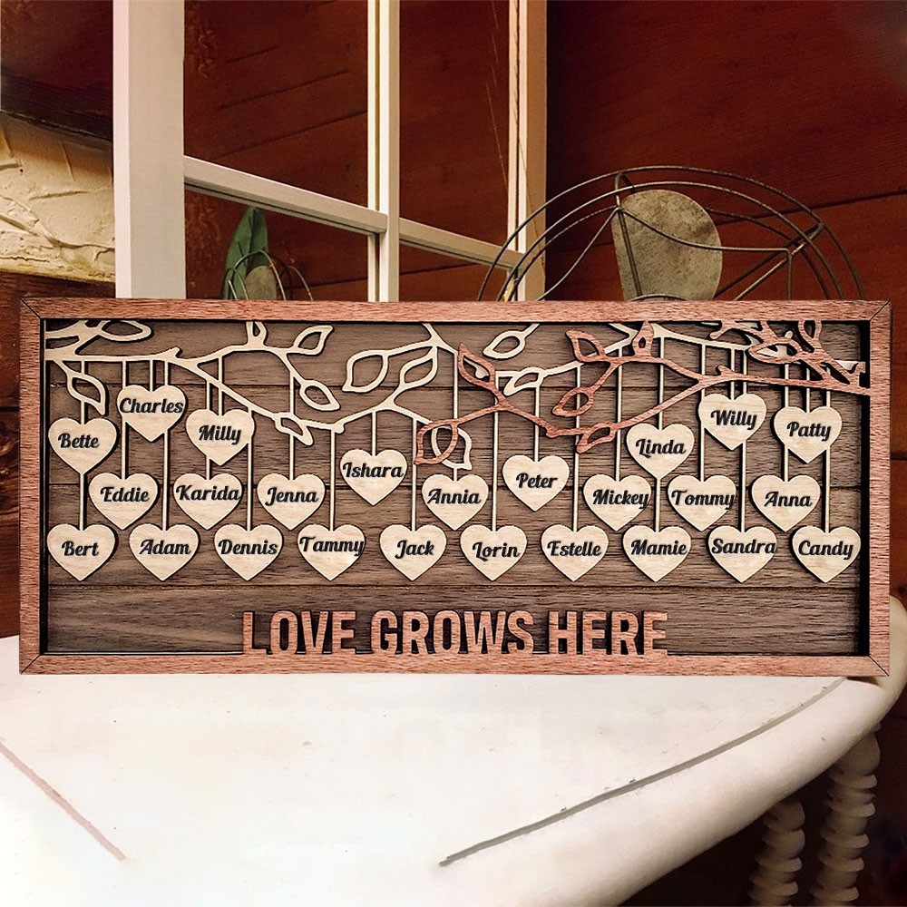 Personalised Wood Love Grows Here Family Tree Frame Sign with Names Keesake Gifts For Grandma Mum Christmas Gift Ideas