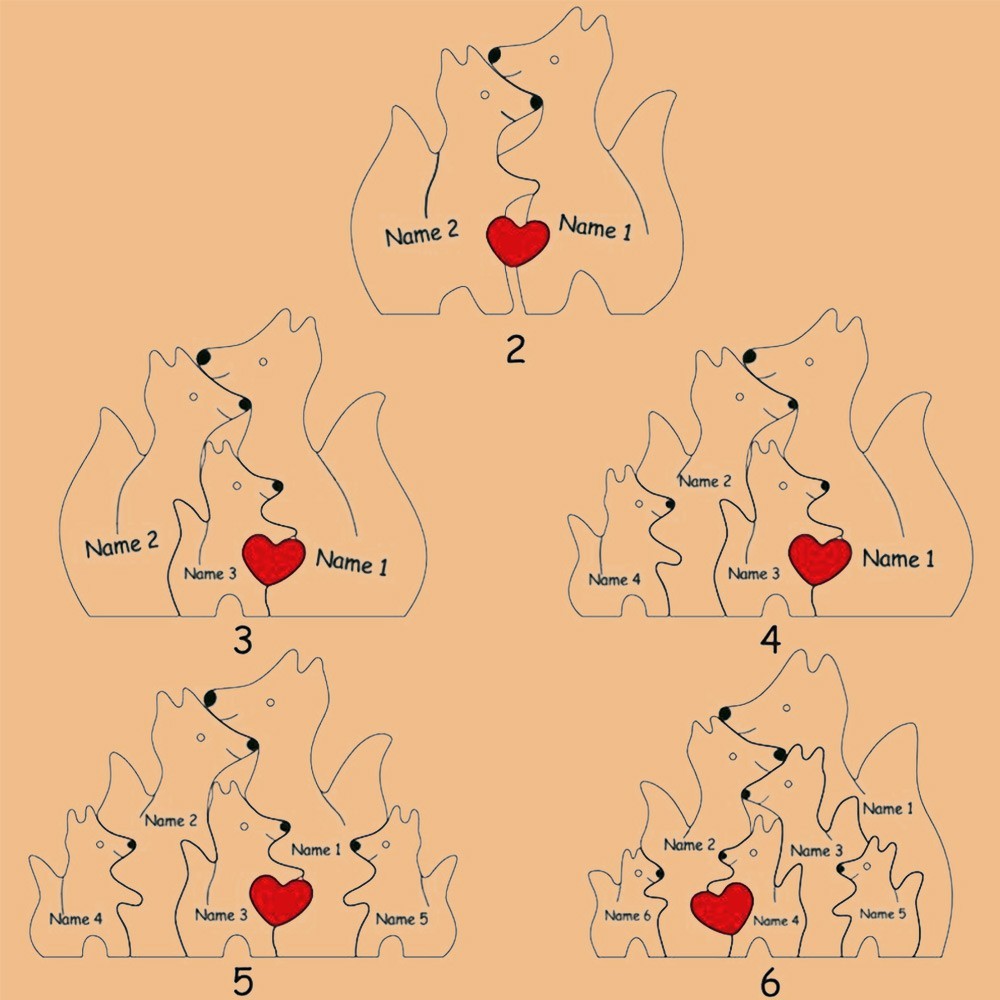 Personalised Wooden Fox Figurines Family Puzzle with Names